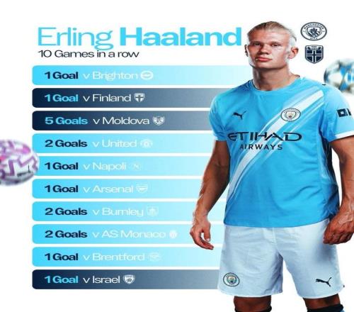 比赛第27分钟,哈兰德单刀破门,根据统计,他已经在俱乐部和国家队的连续10场比赛中打入进球,上一次没进球还是在8月份英超第二轮曼城主场0-2输给热刺的比赛。